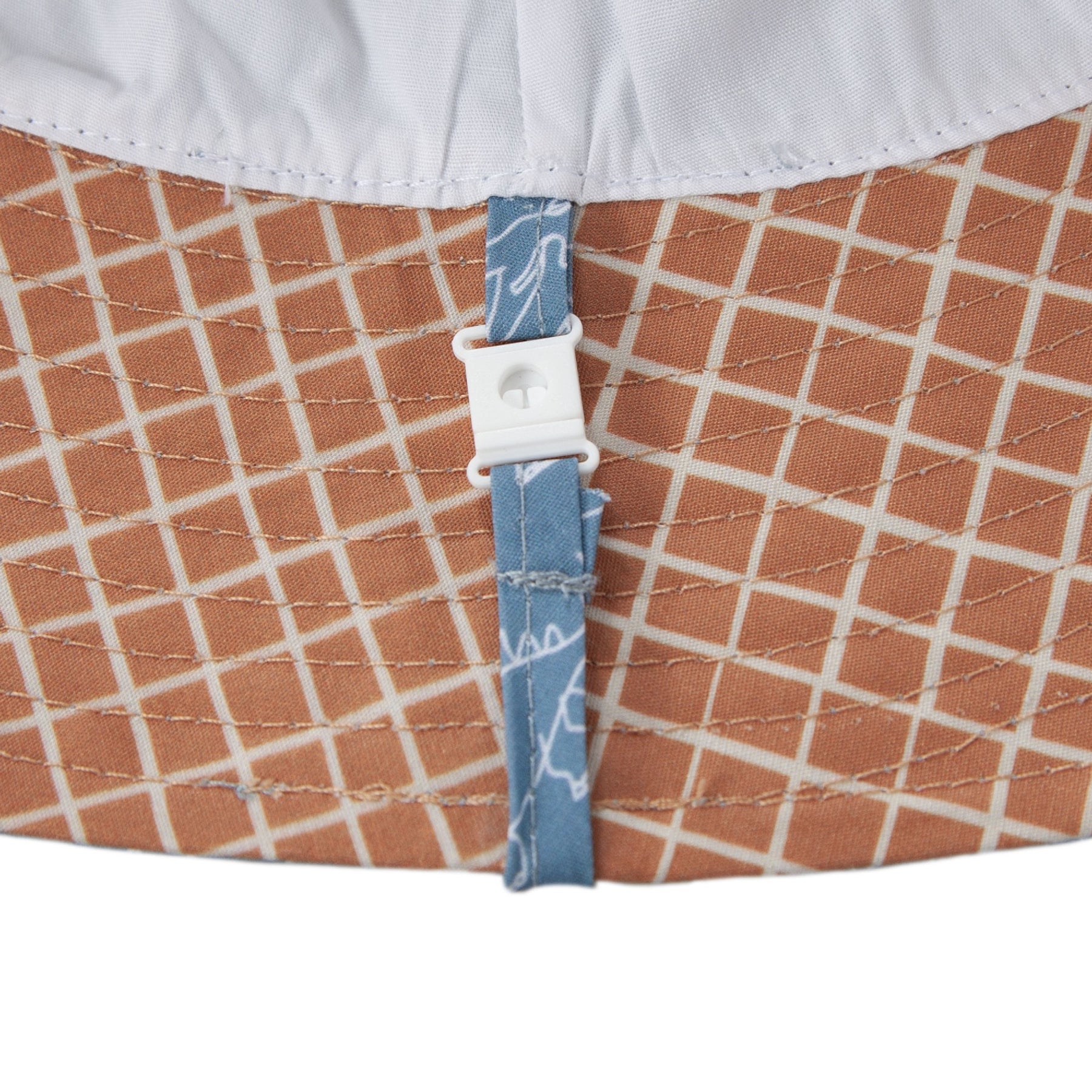Bucket hat with a blue and white dinosaur sketch print on the outside and a chestnut and cream checks print on the inner brim. Both prints were designed by Jacinta Wier from Two Little Ducklings.