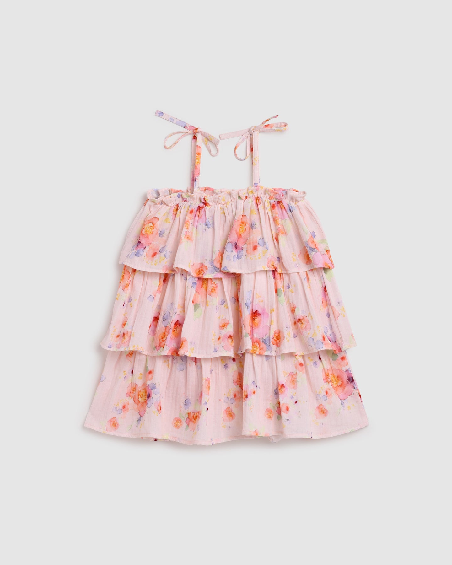 Featuring adjustable tie straps and tiered ruffles adorned with our beautiful roses pattern, this dress is as fun as it is stylish.