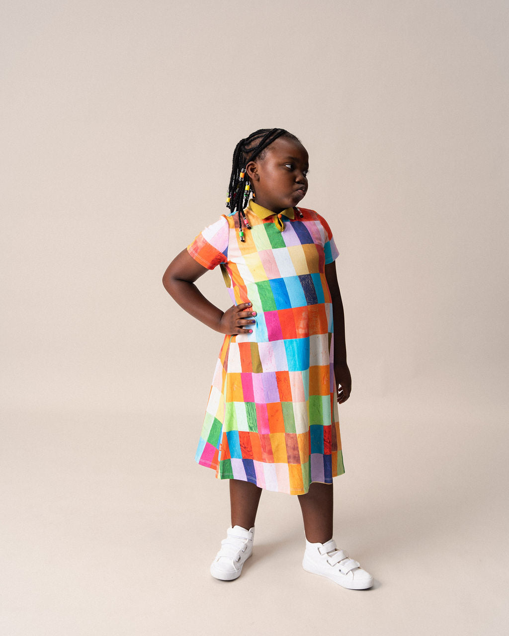Make every day a celebration of colour with thisplayful, colourful 'Allegiance' print dress. Designedwith a mix of bright, bold rectangles in every shadeimaginable, this dress is sure to brighten up anyoutfit.Featuring a cute polo collar and short sleeves, it’sperfect for everything from playdatesto specialoccasions. The soft fabric ensures comfort all daylong, while the easy to wear design makes gettingdressed a breeze. Pair it with sneakers or sandals fora fun, stylish look!