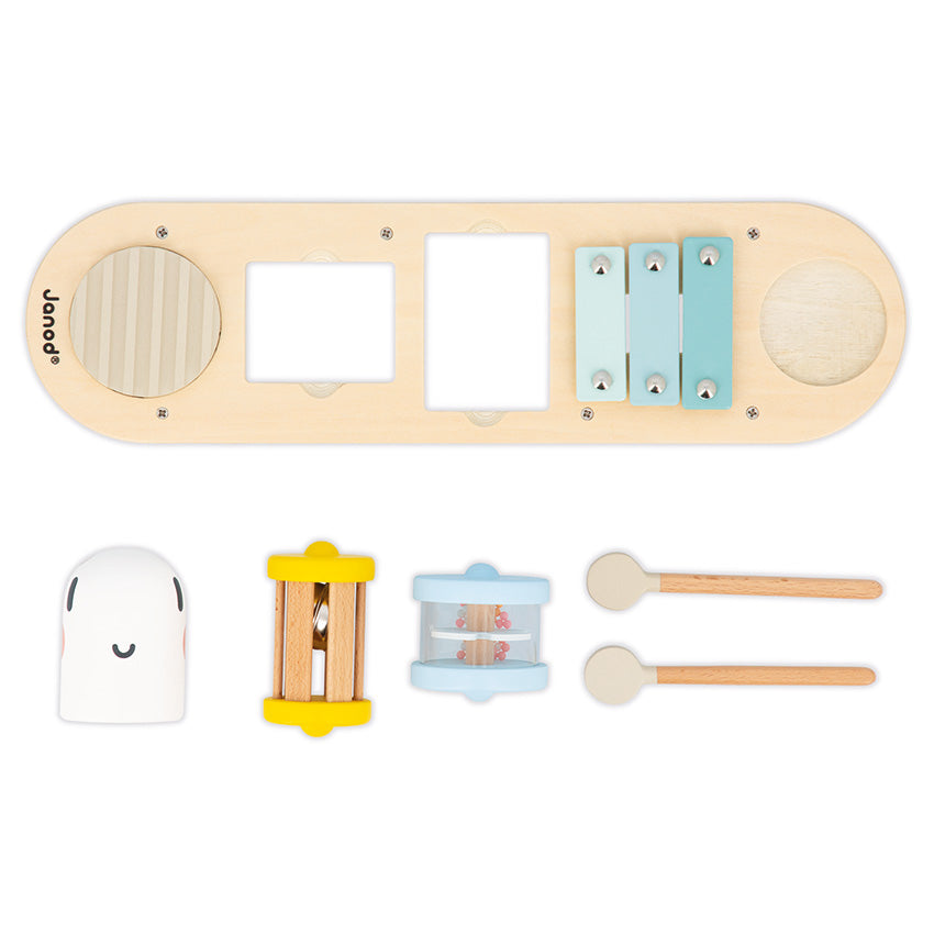 Discover the delightful caterpillar-shaped sound activity table with 5 integrated sound activities, allowing children to explore and create their own symphony. Includes a maracas to add rhythm, a xylophone to play melodies, a bell for a soft sound, a rain stick to imitate the soothing noise of rain and a guiro for a unique sound. Practical and cleverly designed, the sticks are stored in the caterpillar?s head. What?s more, the 2 rattles and the head are removable for even more play options: baby can grab whichever musical toy they choose, shake them to the beat of the musica and then learn to return it to the right place. This educational toy is ideal for helping younger children discover and experiment with different sounds, developing their aural perception. Made with FSC certified wood and complements many items in the Janod Cocoon range.