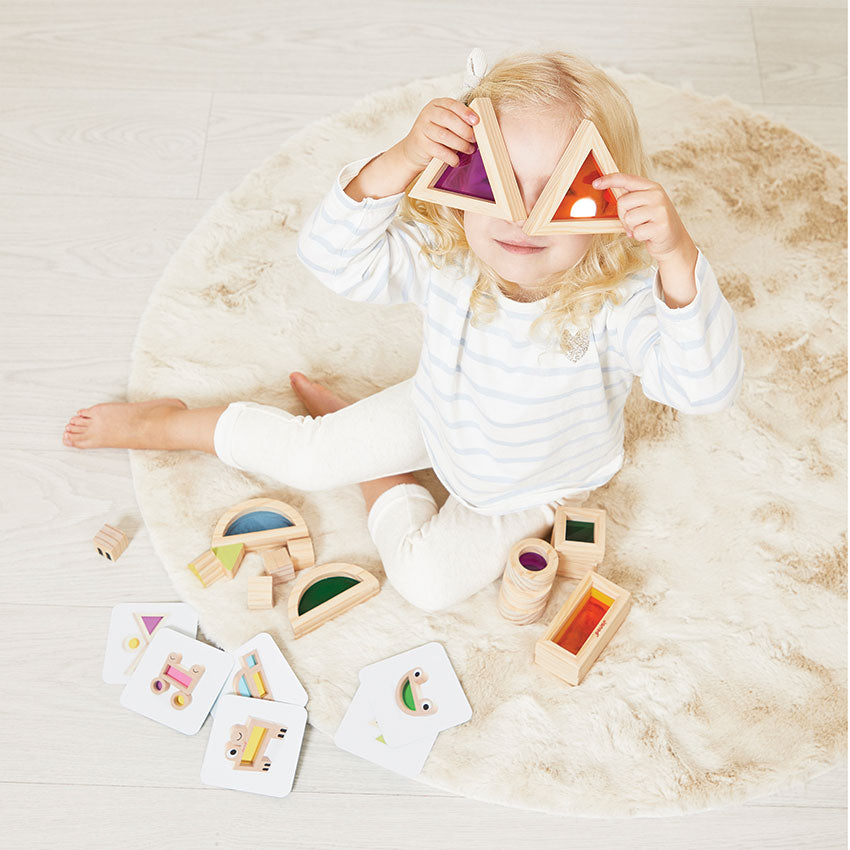 Explore a world of colour and creativity with these 12 beautifully Translucent Sensory Blocks! Watch as little ones discover pink, blue, green, and more while stacking, sorting, and building. The set also includes six small printed blocks for creating fun animal shapes and six template cards to inspire imaginative play before designing unique creations. This engaging toy will enchant children with their optical effects, help develop fine motor skills in young children, while fostering problem-solving and creativity in older ones. Made from FSC certified wood, it?s a perfect early learning sensory toy for children aged 12 months and up.