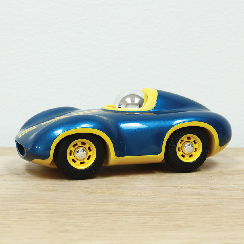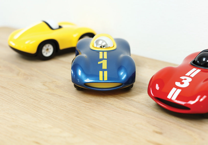 The Mini Boy is a striking metallic blue with yellow trim and chrome helmet and wheelcaps. Designed in the UK, the Playforever range is made from heavy duty plastic and moving rubber wheels for easy handling. With sleek lines and gorgeous curves you can put it on the shelf for decoration or use it for everyday play!