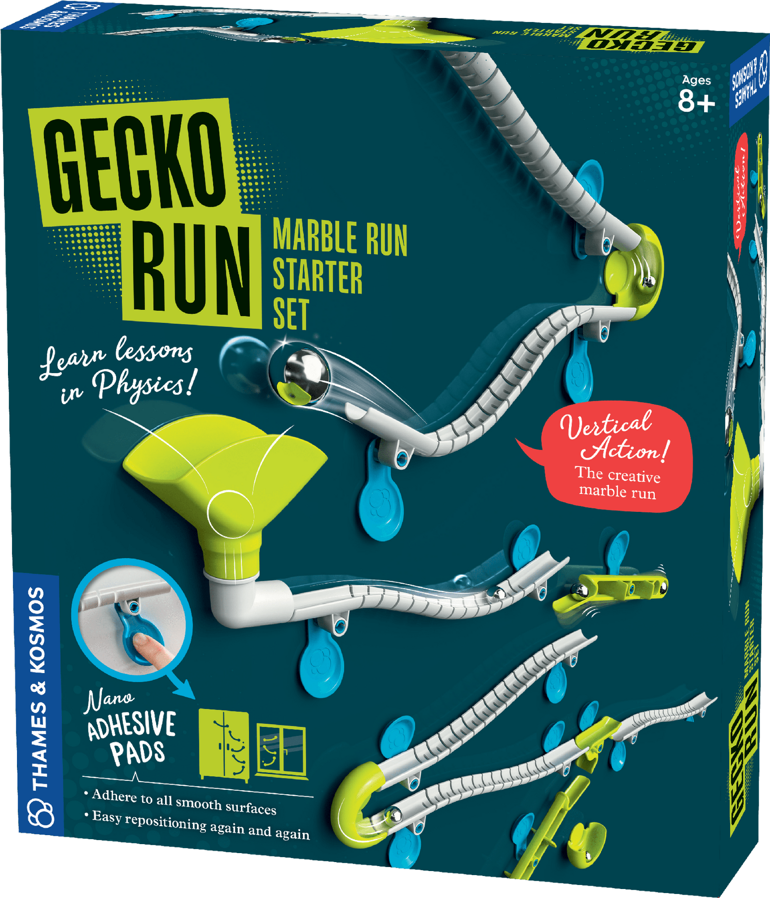 The Gecko Run Starter Set transforms your entire apartment into an exciting playing field! Using residue-free nano adhesive pads, the flexible strips can be individually attached to vertical, smooth surfaces and adjusted with ease in a matter of seconds. Children discover firsthand the impact of gravity on their rolling ball as it gains speed. Whether navigating obstacles, gliding across doors, windows, glass panes, tiles, or shelves, the KOSMOS ball track allows for unprecedented flexibility in construction.