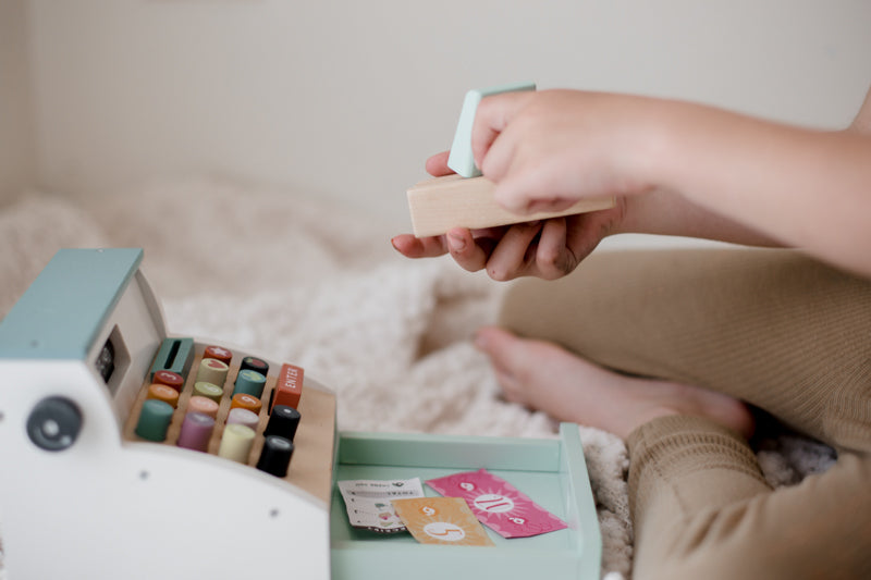Children will enjoy ringing up all their shopping with this fun and colourful wooden till. Slide credit cards along the groove, pop one of 5 printed receipts into a slot, turn the little knob to show different prices through a window. Children will have fun pressing down on the multi-coloured buttons and opening the tray to dispense 5 wooden coins and 9 sheets of coloured paper money. 22cm15cm13.8cm