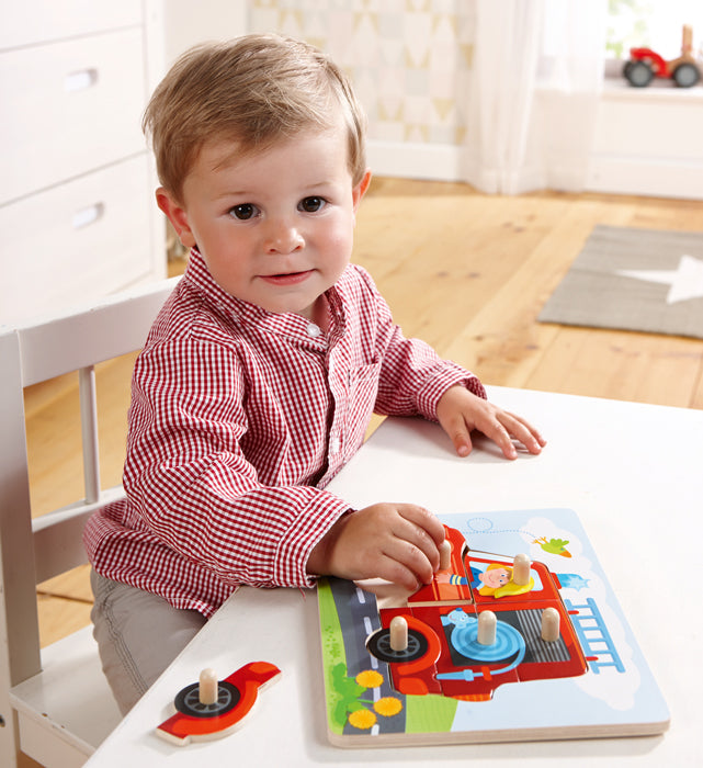 The courageous fireman and his mouse race to the rescue. Assemble the 6 wooden pieces to form the firetruck to help stimulate fine motor skills and coordination. The HABA Fire peg puzzle has chunky pegs which make the pieces easy to grasp and is a perfect introduction to puzzling!